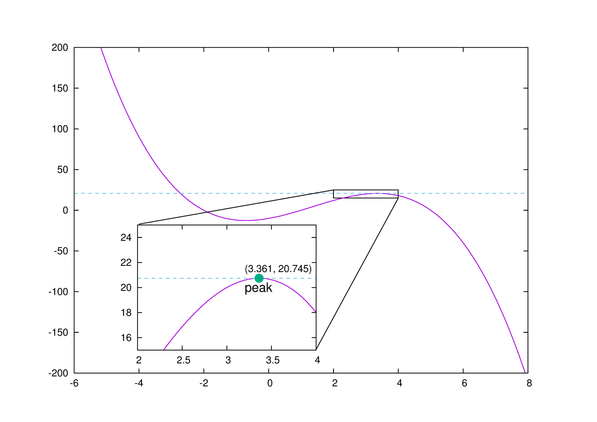 plot -x**3 + 4*x**2 + 7*x - 10, 20.7453 w l dt "-" lc 3, "peak.dat" ps 2 pt 7 lc 2