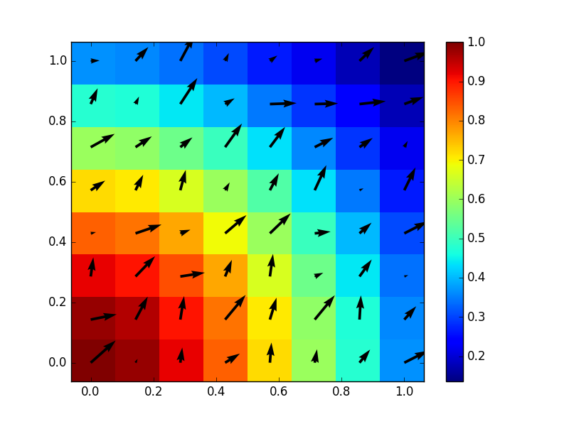 計算結果を3次元可視化ソフトで解析する前に、とりあえず簡単に結果を目で見れるようにしたい、ということでmatplotlibのpcolormeshとquiverを使って2次元平面でのスカラー場とベクトル場の可視化を行うスクリプトを作りました。
